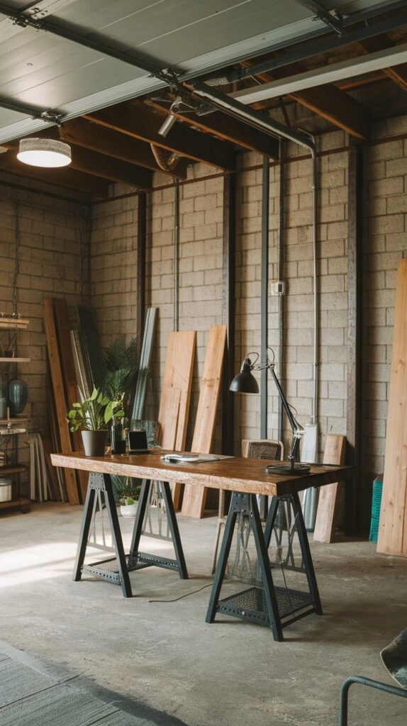 Creating a home office in your garage can be both stylish and sustainable. Using reclaimed wood for shelves and a desk not only looks great but helps reduce waste. Add some plants to bring life into the space and improve air quality.