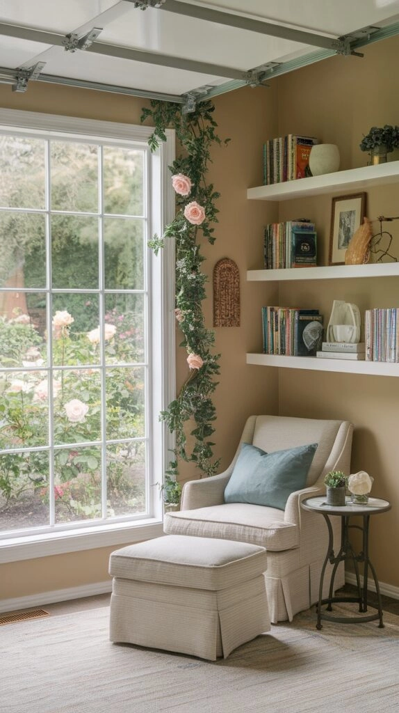 Create a cozy reading nook right in your garage! A comfy chair paired with large windows allows natural light to flood the space, making it perfect for curling up with a good book. Add some plants and personal touches to make it truly yours.