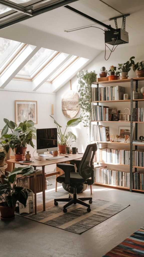 Skylights are a great way to bring in natural light and make your garage office feel open and airy. They not only illuminate the space but also create a relaxing atmosphere that helps you stay focused. Pairing skylights with plants can enhance the vibe even more!