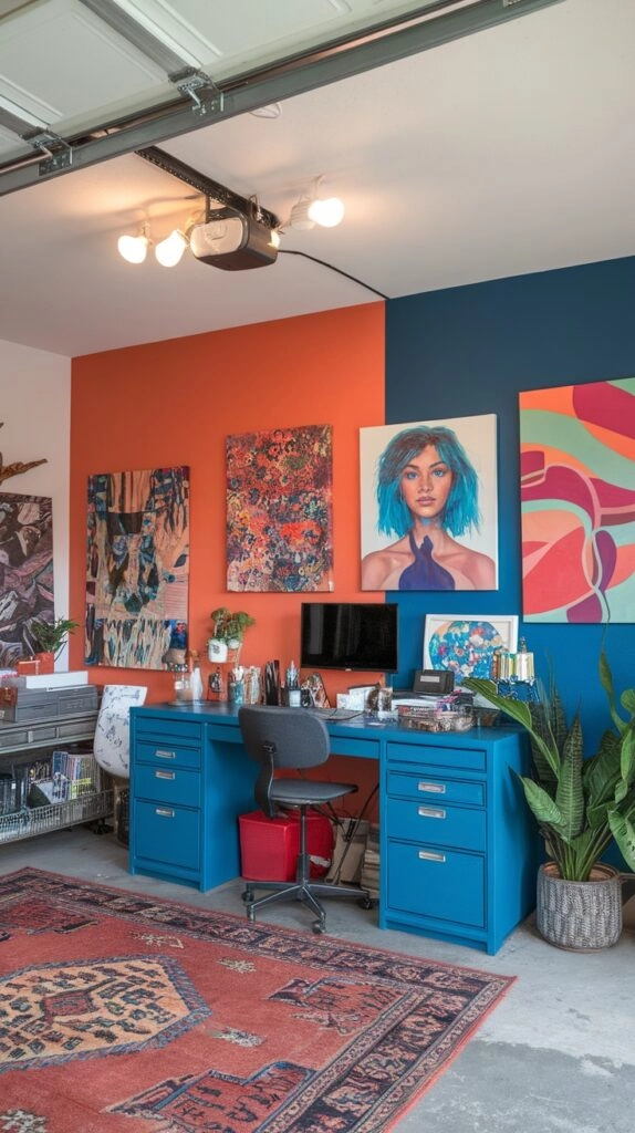 Colorful accent walls can really bring your garage office to life. A bold orange or deep blue can create a fun vibe, making work feel less like a chore. Pair these colors with some eye-catching art, and you’ve got a perfect place to spark creativity!