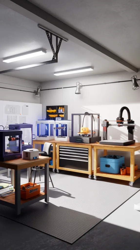 A well-organized layout includes dedicated stations for printing, assembly, and finishing work, ensuring an efficient workflow. Shelving and storage bins house filament spools, resin, cutting materials, and electronic components, while a pegboard keeps essential tools like calipers, soldering irons, and precision knives easily accessible. Ventilation and dust control systems maintain a clean and safe environment for working with various materials. Whether designing functional prototypes, personalized gadgets, or intricate art pieces, this garage makerspace is the perfect setting for turning creative ideas into reality.