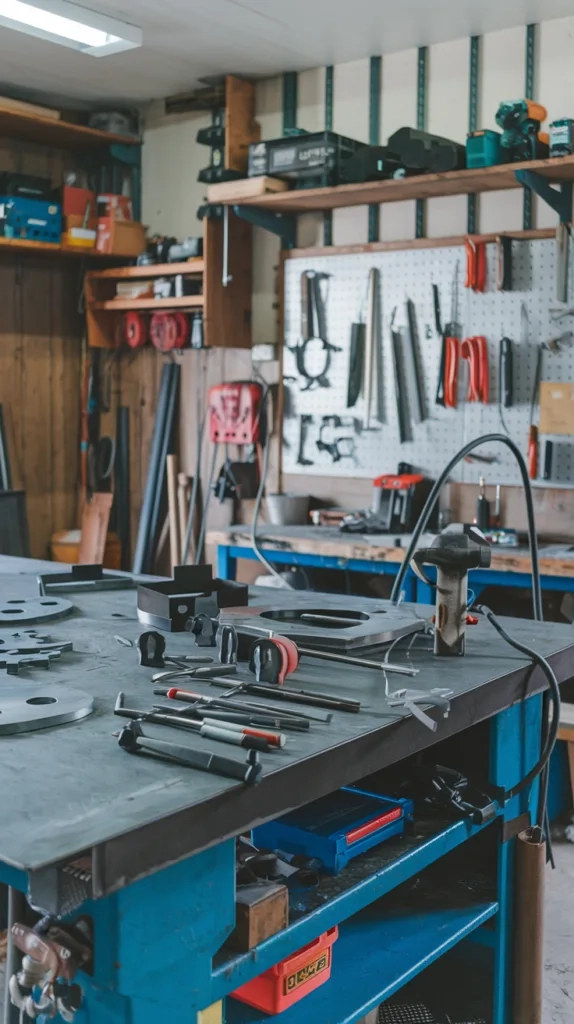 A well-organized metal fabrication workshop is the foundation for precision and efficiency. This workspace features a sturdy central workbench with a metal top, perfect for welding, cutting, and assembling metal components. Various clamps, hand tools, and metalworking accessories are neatly arranged on the surface, ensuring easy access for detailed work.