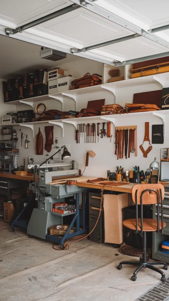 A well-organized wall-mounted pegboard holds essential hand tools, while shelves and drawers store different types of leather, dyes, thread, and hardware. A dedicated stamping and embossing station allows for custom detailing, while proper lighting ensures intricate work is done with accuracy. With a clean and organized layout, this garage studio is the ideal space for leather crafters to design, shape, and hand-stitch beautiful, long-lasting creations.