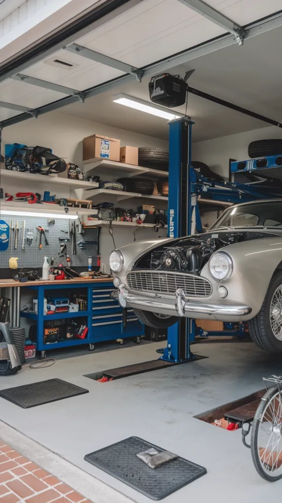 A dedicated workstation for oil changes, tire rotations, and brake repairs makes routine maintenance seamless. Ample lighting and ventilation enhance safety, creating a comfortable environment for working on vehicles. Whether restoring a classic car, tuning up a daily driver, or performing performance modifications, this garage is the ultimate setup for any car enthusiast looking to keep their ride in top shape.