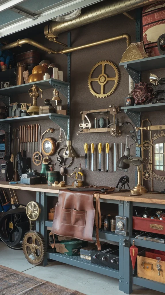 The Steampunk-Inspired Workshop transports you into a Victorian-era realm where imagination and craftsmanship blend seamlessly. This enchanting garage workspace is adorned with antique brass fixtures, exposed gears, and intricate piping, evoking a sense of retro-futuristic adventure. Weathered wooden workbenches, paired with leather-bound toolkits, set the stage for creating fantastical gadgets and whimsical contraptions.
