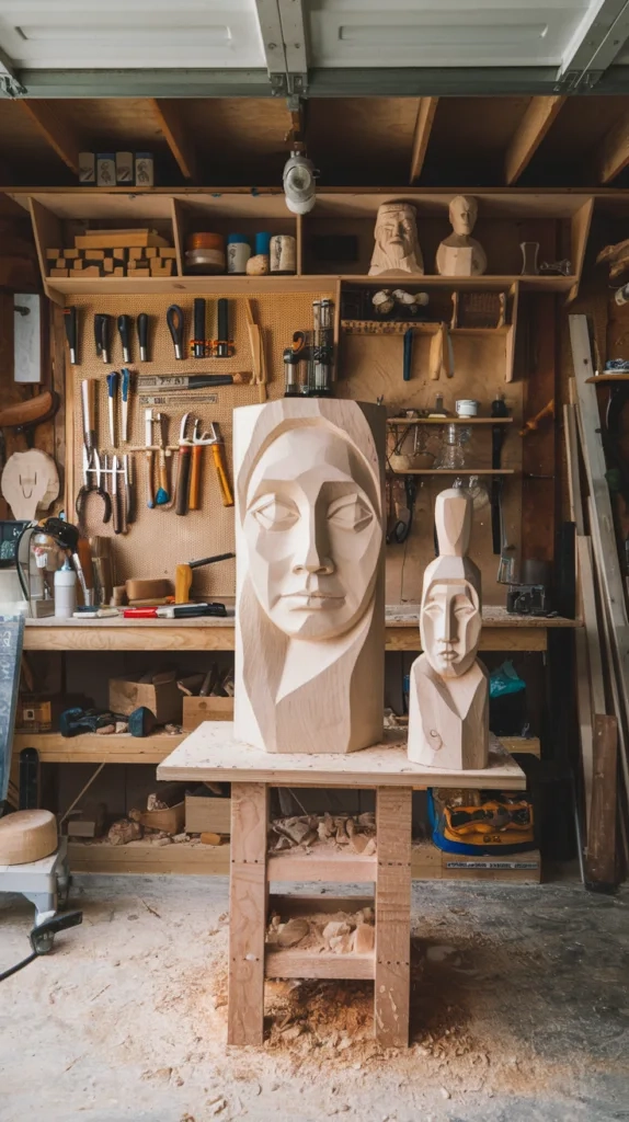 The Home Garage Sculpting & Carving Studio is a creative haven for artists working with wood, stone, and other sculpting materials. Designed for both beginners and experienced sculptors, this workshop features a spacious workbench with sturdy clamps for securing materials, along with a well-organized tool wall holding chisels, gouges, rasps, and carving knives.